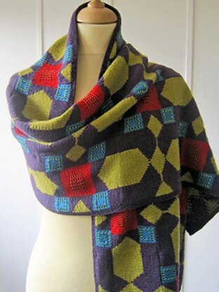 This is a knitted wrap/shawl made from 2 intarsia and beaded knitted squares, which are joined together as you knit. The design looks more complicated than it is and would make a wonderful blanket if you made it bigger.