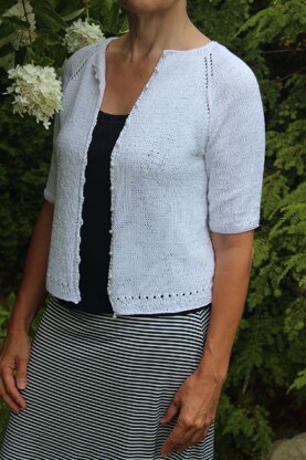 Worked from the top down in a fingering yarn with good drape, Morpho is sure to become a favorite in your spring and summer wardrobe. It's simple slip stitch crochet edge form the loop style buttonholes and add to the delicate look.