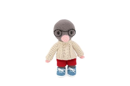 Mortimer is a little mole wearing a removable cable sweater (fastened with a button), shorts and shoes. Instructions for his little wire glasses are also included in the pattern. Mortimer can stand up and sit down and so he is very easy to pose.
