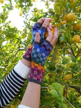 I love Madelinetosh Merino light and had all these colors and wanted some way to show them all off. These are knit in the round, and are easier then they look. This would be a great pattern to learn stranded color work. This is a fun pattern to use up all your sock bits, or buy a kit from Cashmere Junkie The gloves would look great in a rainbow mix, only two colors for a checkered look, or a mix of random colors.
