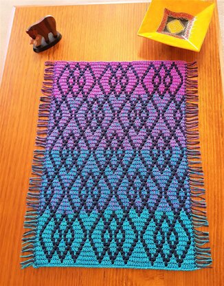 The pattern is for a mini table mat but is suitable for blankets, scarves or cushions etc. Included are some details on how to use this pattern for other projects like a throw or a cushion.