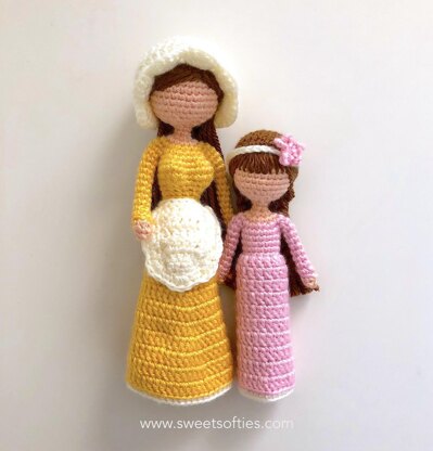 The Mother & Daughter Pattern provides instructions for crocheting this elegant pair. The mother wears a bonnet and apron, and the daughter dons a flower crown. Their simple, traditional, yet classic look is inspired by Amish, Mormon, prairie, and colonial cloth dolls. This special design, showing the love and unique bond between a mother and her daughter, makes a wonderful Mother’s Day gift and heirloom gift.