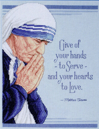 Designed by: Sandy Orton. Mother Teresa, Angel of Mercy 1910- 1997. One of the greatest saints of out time. She founded an order of nuns in Calcutta, India to serve the poor. Hers was a Jesus-centered life. Her words offer a lifetime of inspiration, hope and guidance in this Counted Cross-Stitch design licensed by Corbis.com and adapted by Sandy Orton. They read: "Give of your hands - to Serve - and your hearts to Love,"
