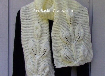 Textured scarf with 3-dimensional leaves - satisfying to knit and wear! It is worked in the popular leaf and garter stitches. Size: approximately 10” (25.5 cm) wide x 63”(160 cm) long. For the sample, ½ ball Lion Brand Pound of Love (1020 yds/932 m, 16 oz/454 g per ball) was used. Substitute: 2 skeins worsted wool/acrylic yarn (200-220 yds/180-200 m, 3.5 oz/100 g per skein) - you need approximately 450-500 yards of worsted yarn.