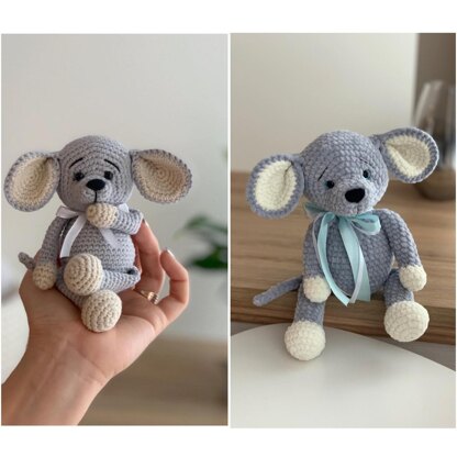 Materials and Tools: For toy from velvet yarn: • 1 skein (maybe a little bit more) of grey color plush yarn (for example, Yarnart Dolce, Himalaya Dolphin Baby, Bernat Baby Velvet yarn-100g/120m per skein). I used Himalaya Dolphin Baby nr.80357 • A little of cream color plush yarn. I used Himalaya Dolphin baby nr.80308 • A little of black color cotton yarn for muzzle. I used Alize Cotton Gold nr.60 • 4mm crochet hook • safety eyes 13mm • soft stuffing • thin long needle and needle with a large eyelet • marker • yarn cutter or sharp scissors