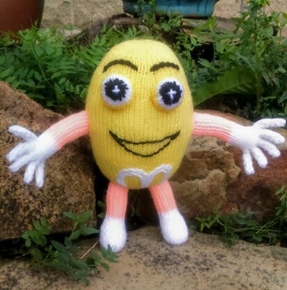 Mr M&M Yellow candy man is knitted flat, seamed and then stuffed. Step by step instructions are given for each piece required and there is a section at the end on how to put the pieces together.