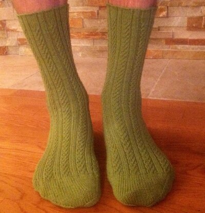 The medium size has a 25cm (10") foot length and the large size has a 28cm (11") foot length. Yarn requirements are 408 - 500 yards (373 - 457 m) This is a great pattern for newer sock knitters as well as a quick knit while watching TV for those who are more experienced. Stitches are knit, purl, and a right twist stitch that is clearly explained on the pattern.