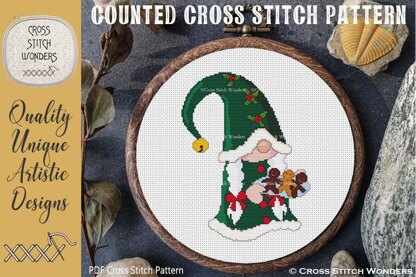 An Adorable Christmas Ms. Gnome with a delicious plate of Gingerbread Cookies counted cross stitch design!\nCross Stitch Pattern designed by Marcia Manning.\nDesign is 90 stitches wide by 118 stitches high.\nPDF is a COLOR counted cross stitch chart which lists suggested DMC floss colors, and includes a color picture.\n\nStitched design size is as follows:\nSize 11 count: 8.18 x 10.73 inches or 20.78 x 27.25 cm\nSize 14 count: 6.43 x 8.43 inches or 16.33 x 21.41 cm\nSize 16 count: 5.63 x 7.38 inches or 14.29 x 18.73 cm\nSize 18 count: 5.00 x 6.56 inches or 12.70 x 16.65 cm\nSize 22 count: 4.09 x 5.36 inches or 10.39 x 13.62 cm