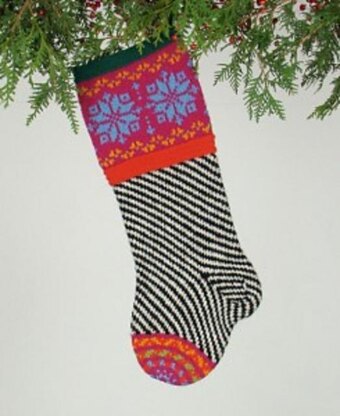 PATTERNS provide clear written instructions, along with color charts for each colorway, to knit a Christmas stocking in the round. Stockings measure approximately 20"x7", varying in size with individual designs.
