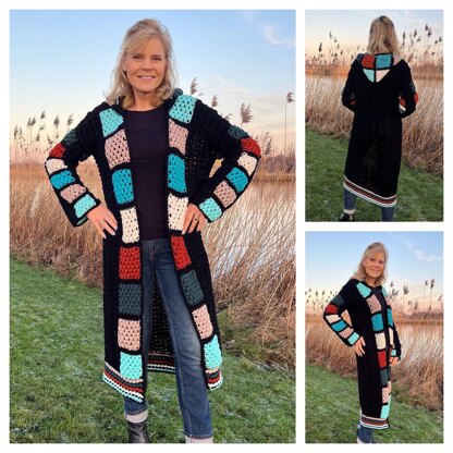STOP! Don't throw away your leftovers... They are needed to make this great looking Cardigan. I added some black; so the colors have more depth. The stitches are easy and basic. After the squares are connected, the cardigan gets made sideways, so by adding rows, you can make it any size you want. The back is crocheted entirely sideways.