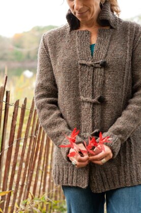 Knit in pieces from the bottom up, Mulled Cider is a sweater version of your favorite duffel-style coat. Simple lace detail runs up the front and down the back of one side, and a generous collar add a little flair. The front bands are wide and ribbed, with i-cord toggles meant to showcase your favorite leather buttons! I suggest a rustic tweed for an outerwear garment such as this, in a 100% wool blend that will wear well over time.