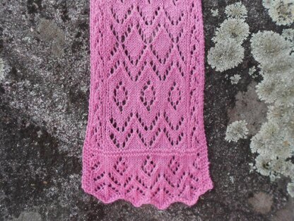 The scarf features a fancy diamond lace stitch design that runs up the body of the scarf and is bordered with a delicate little lace stitch to frame the center pattern. The scarf is knitted, with fingering weight yarn, in halves beginning with the border, and then worked up to the center where it is joined with the Kitchener Stitch for a balanced look. There are colored charts as well as written directions to work this gracious scarf!