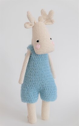 This is Murphy moose! He is the friendliest, cutest moose around. When finished he measures around 18 inches tall (when using the recommended yarn and hook) The pattern includeds instructions for his dungarees. The Pattern is step by step, I recommend it as a confident beginner/intermideate pattern. The instructions are detailed and easy to follow if you know the basic stitches and techniques used to make amigurumi . There are lots of pictures included in the pattern.
