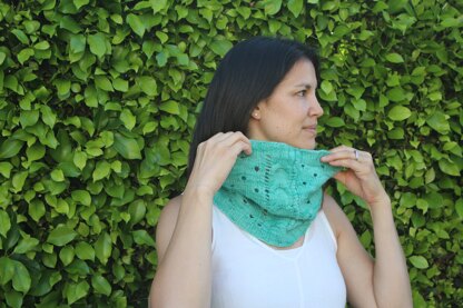 Murvie Cowl has a rich lace and cable pattern. The length and width can be easily adjusted. This is knit in the round, and knits up superfast. Every row is written out and charted. Suitable for Sport yarn.