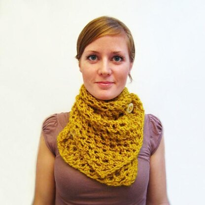 A simple short scarf featuring open work and a button closure. Compliments the uniqueness of hand died and hand spun yarns beautifully. Perfect instant gratification knitting or a project for that last minute gift.