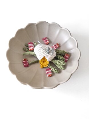 This is an intermediate pattern because although many of the stitches are very beginner friendly, the construction methodsfor some elements of this dish are more unusual and will require a little more focus.