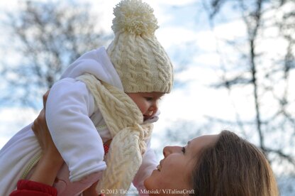 This beautiful cable set is perfect to keep your little one warm during winter time. Hat and scarf have matching cable pattern. The hat is knitted in the round. It has ear flaps for extra warm and comfort. The hat is decorated with big pompom and pearl beads. The scarf has a loop on one end so it can be used either as a baby scarf or as a female headband. I made this baby set in white color using DROPS merino extra fine superwash yarn but actual color and type of yarn can be varied.