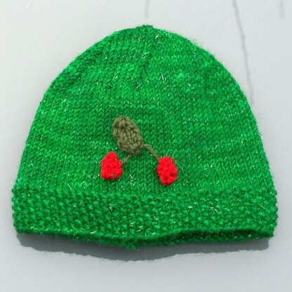 This adorable beanie is a bottom up design with a moss stitch border, which complements the My Little Cherry cardigan. The cute little cherries are knitted create a 3D motif.