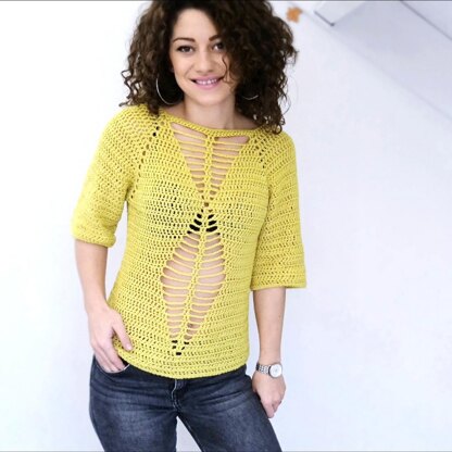 "My Lucky" Blouse is a top-down blouse worked with raglan technique. We are first working the yoke, starting from the neck and then we will separate the sleeves from the body of the blouse and work each part individually. "My Lucky” Blouse has a geometrical element on the front side made with chain stitches. The length of the blouse or of the sleeves can be easily adjusted just by working more rounds. The Skill level is Easy. All you have to know is to work in circular rounds and basic stitches.