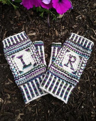 My Sense of Direction Mitts, a tongue-in-cheek design. Pattern includes both charts and written directions and includes charts for both upper and lower case L and R.