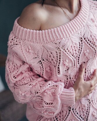 My Valentine is an oversized sweater with puffed sleeves. Its main feature is large heart-shaped lace (therefore the name) on the front of the main body and sleeves. It is worked bottom-up, main body and sleeves as 3 separate pieces in the round up to the armholes. Then the 3 pieces are connected to work the raglan yoke and the neckband.