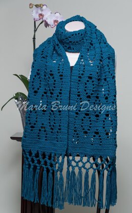 Mystic Rivers Shawl-Scarf is exquisitely textured by using Double Crochet stitches creating joining waves. The Shawl – Scarf width, with the length makes it suitable to wear as a shawl or a scarf. The Lattice Knot fringe brings this Shawl-scarf to the next level of elegance and style.