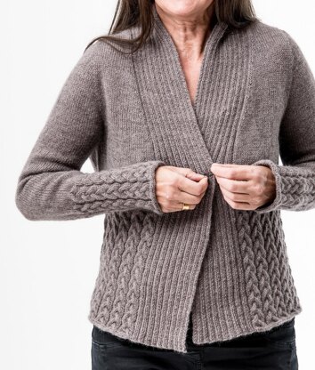 The Nala Cardi is worked seamlessly from top down. It starts with a provisional cast on for the shawl collar from which you pick up stitches for the neckline shaping. Shoulders are shaped by using the contiguous method. When shoulder shaping is done, increases for sleeves and front shaping will be worked parallel. After sleeve dividing it is just going on straight until cables. Before the cables 2 sts have to be increased and decreased after cables are done.