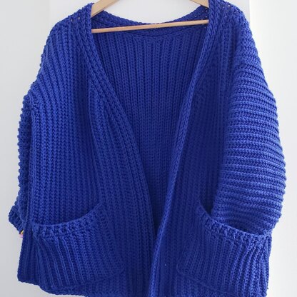 The Namono Cardigan is made of a back panel, and two front panels that are seamed together. All panels are worked from side to side. The stitch design used makes this cardigan a warm and cozy piece. And for extra coziness it has side pockets.