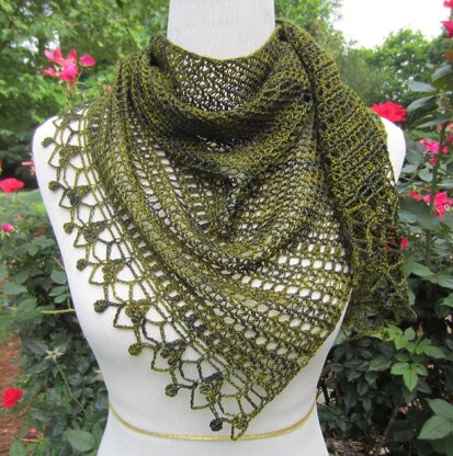 Nanci is a light, assymetrical wrap which can also be worn as a scarf. The design begins with one stitch and gradually increases in length and width. It is finished on one side with a fun, lacy edging.
