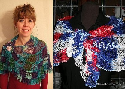 This net shawl or wrap is lightweight and perfect for a spring or summer accessory. Rather than using the popular net yarn to make ruffles or a scarf, it connects the yarn top to bottom to create an airy fabric. The shawl is half circle in shape, and the wrap is a bit more stretched out, becoming longer and thinner than the shawl.