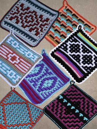 Pattern booklet includes written instructions as well as optional graphs for Fiesta, Mesa, Taos, Apache Tears, Diamond, Southwest Style and Tribal Traditions Potholders. Easy to do and perfect "take-along" projects.