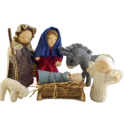 The instructions to make 6 characters are included in this pattern: Joseph - with a hat, cloak and staff, Mary - in her simple dress and cloak, Angel - with wings, flowing hair and a halo, Baby - wrapped in swaddling bands, Donkey - solid and doe eyed, Lamb - small and cute with a bell.