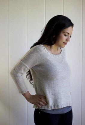 Nehemiah is a light, reverse stockinette pullover knitted from the bottom up with an A-line construction. You have the option of working the 3/4 sleeves either from the bottom up and seaming them to the body or picking up stitches and working them from the top down. Simple knit and purl stitches create an interesting neckline design while 2x3 ribbing creates bold edges. This pullover is designed to be cropped, but length can be easily adjusted.