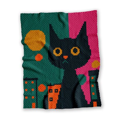 Using the Corner-to-Corner (C2C) crochet technique, pixel-style design features a wide-eyed black cat set against a vibrant cityscape of teal, pink, orange, and yellow blocks. It’s the perfect modern throw for cat lovers, city dwellers, or anyone who enjoys statement-making handmade décor.