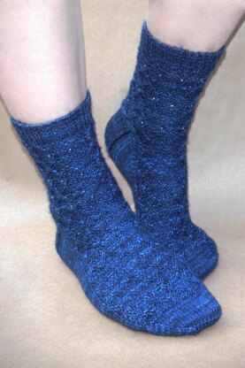 Twisted stitches create a net pattern over the leg and foot of this sock. Beads are optional but add a nice sparkle to the leg.