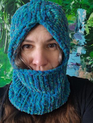 The neck part of the balaclava is knit in the round, and the top part is knit flat.