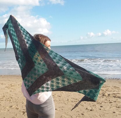 Asymmetric arrowhead shawl with wide stripes of relaxing garter stitch and beautiful dew drops lace.