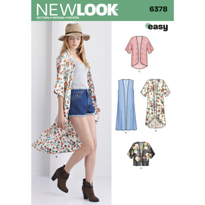 This Easy kimono pattern includes long high low kimono and short kimono with half sleeves, cropped kimono with fringe hem, and floor length kimono vest. New Look sewing pattern.