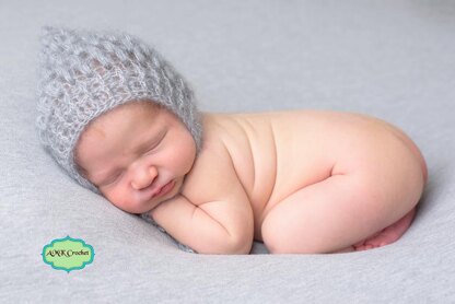 This crochet pattern gives you the instructions, so that you can make a newborn lace puff pixie bonnet hat.