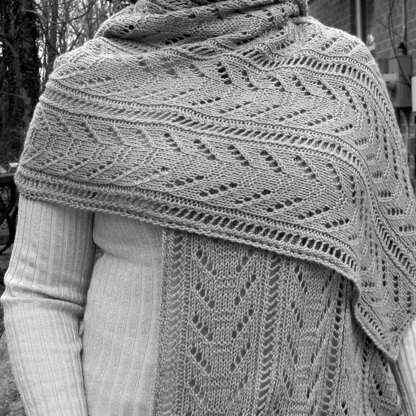 The shawl features two variations of the knit “ladder” stitch, both of which are very simple. One is a knit purl combination, and one is a bit more open, but still a knit purl combination. The second shows off the focal stitch nicely, while still being a suitable pattern for a beginner.