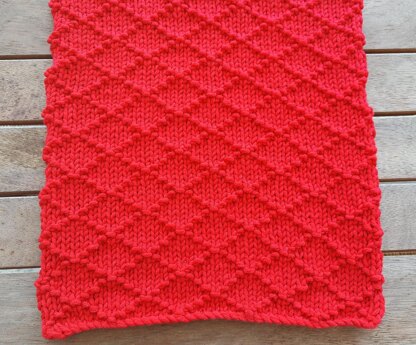 This diamond stitch scarf or cowl can be left unsewn and worn as a chunky scarf, or join the edges to create a cosy cowl. The diamond is created from an easy to work 8 row pattern.