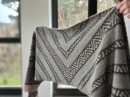 The Nightfall Shawl is a shawl worked flat back and forth, shaped in the center as a triangular shawl, and growing in a diagonal direction on each side. It starts in the center of the upper edge with a garter tab cast on. There are alternating stockinette and mosaic sections, the shawl ends with twisted 1/1 rib.