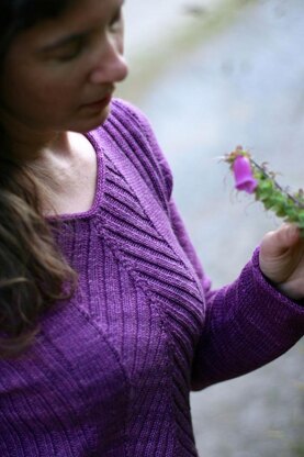 Take advantage of the natural bias lines and curves created by increases and decreases in your knitting. This flattering sweater is knit from the top down making it a breeze to customize for your body shape.