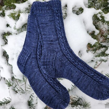 The DK yarn and loads of texture make these socks so squishy and fun to wear. The deep, dark blue of Njord needed bold motifs to show up the stitch pattern.