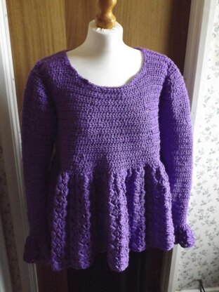 Empire waisted tunic, worked in an Aran (worsted) weight yarn. Lacy skirt and cuffs, main body worked in half trebles. Pulls over head. Fitted sleeves.