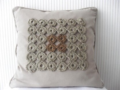 A classic and elegant cushion in two soft, earthy colors will be a fantastic addition to any room. It is a great pattern to make: it is fun and it works fast up. The crochet stitches used in this pattern are very simple; only what you have to know is how to make a chain stitch, slip stitch and double crochet. At the end, you sew your crochet work onto the front of the pillow case (bought or self-made).