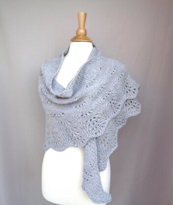 A chunky knit, top-down shawl in stockinette stitch, with a lace pattern that is repeated more frequently towards the hem creating soft scallops.