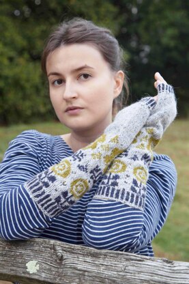 These long-length fingerless mittens are knitted in the round on four double-pointed needles. They have a pretty Fairisle geometric flower design in three colours with two-tone hems at each end of the mittens.