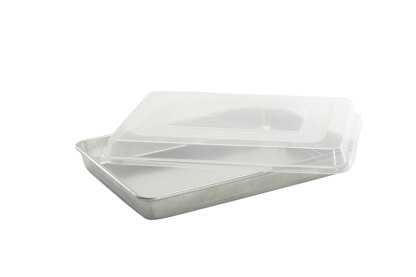 This generously sized sheet cake pan made of natural aluminum has a cover for storing and transporting all of your delicious creations. The lid is made of BPA- and Melamine-free polypropylene. Proudly made in the USA.