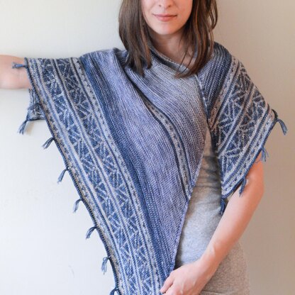 Northern Night Shawl is a top-down triangular shawl, an evolutive knit that is made using three colors, blended together by fading into each other and on intricate Fair Isle patterns.